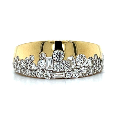 Crafted with a two-tone gold design, the yellow gold setting highlights and intensifies the color of the fancy yellow diamond, while the white gold halo and band complement the surrounding white diamonds for a seamless, brilliant finish. With a total diamond weight of 0.85 carats, this ring offers impressive presence while maintaining a refined and elegant look.